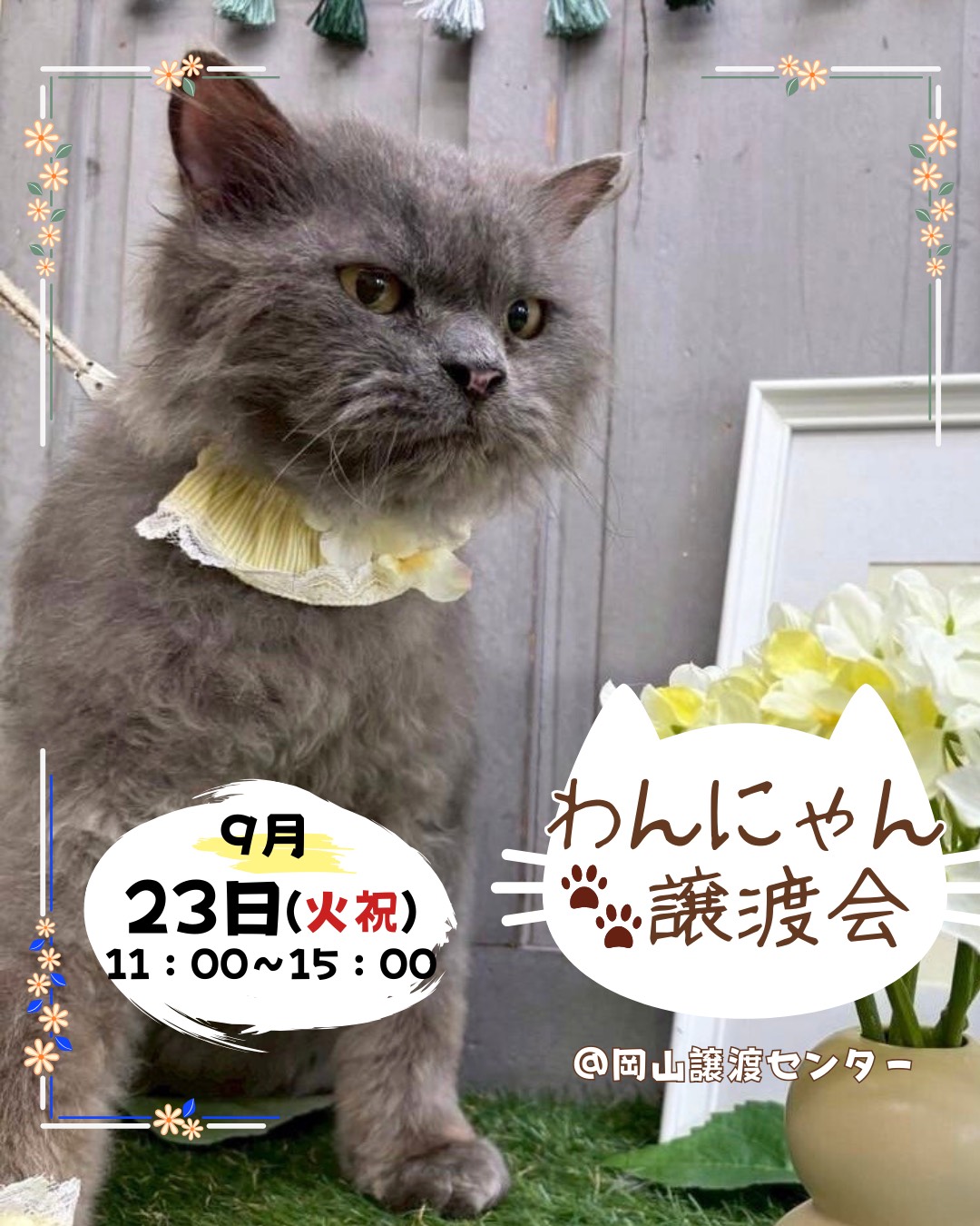 9/23(火祝) 岡山譲渡センター にて11時から15時まで開催します。