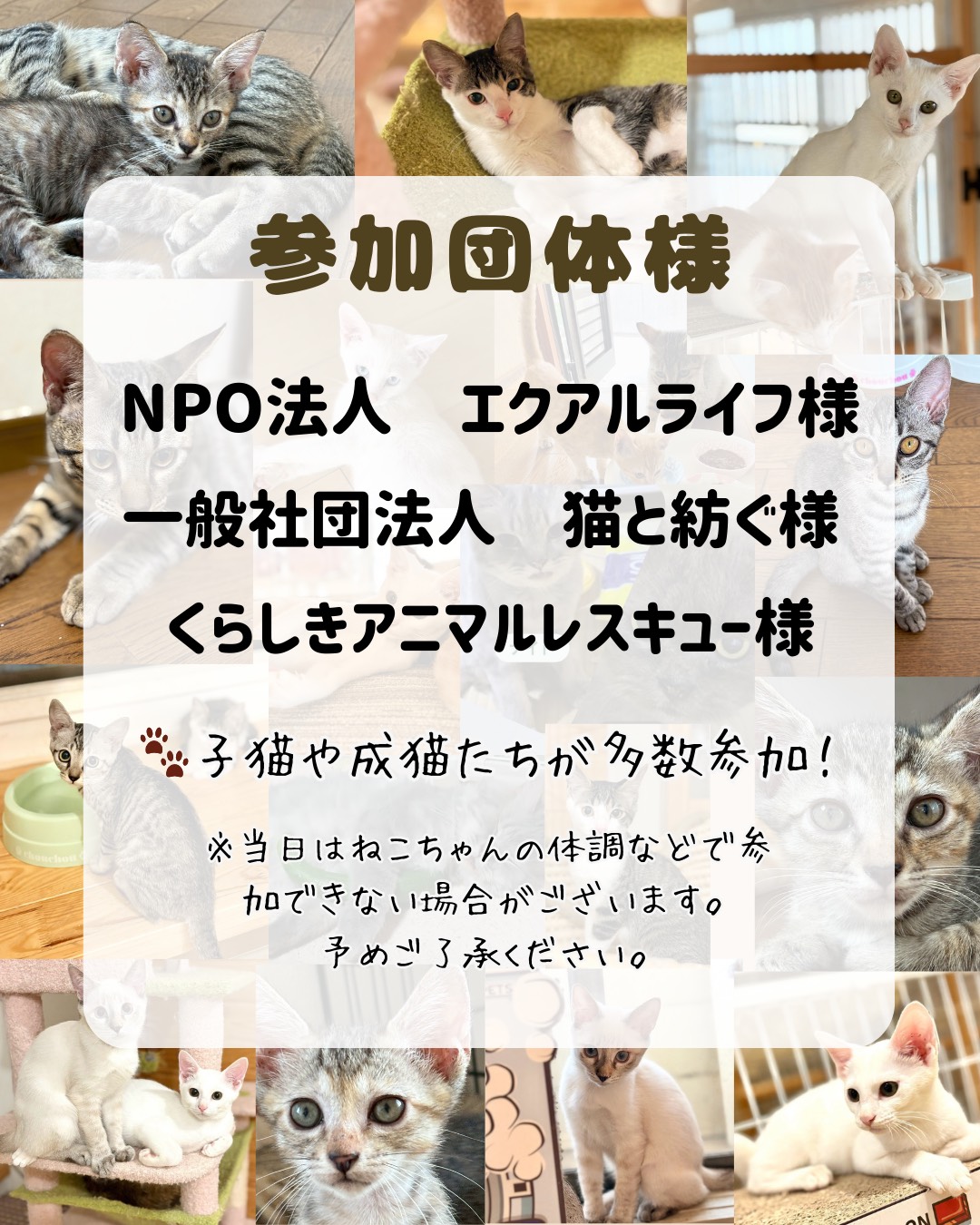 参加保護猫団体様は【NPO法人エクアルライフ様】、【一般社団法人猫と紡ぐ様】、