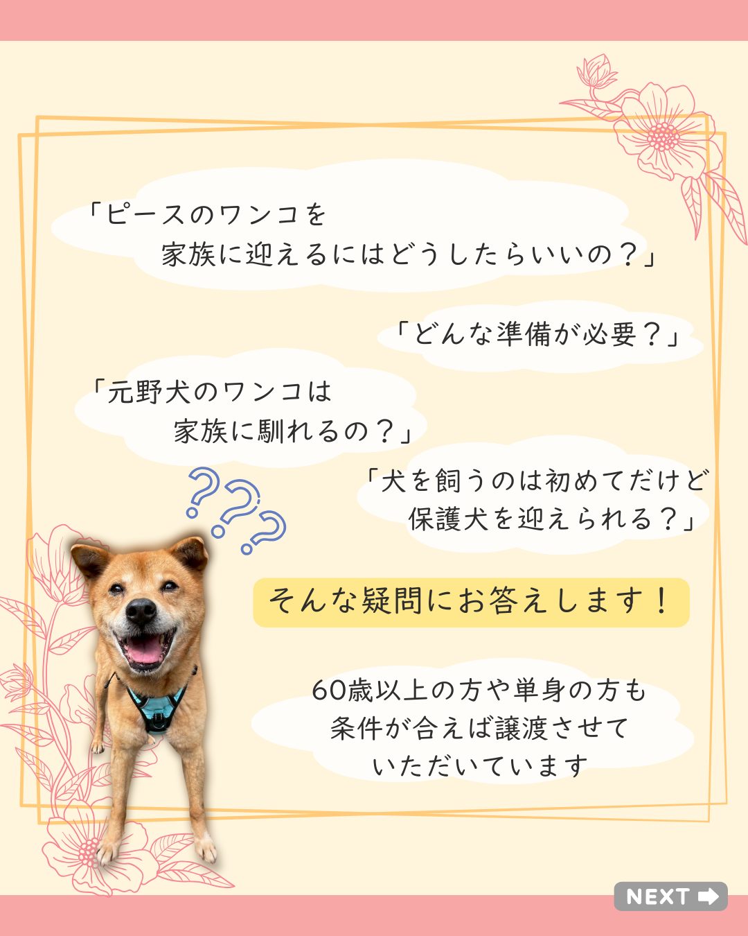 ピースワンコでは、60歳以上の方、単身の方にも条件が合えば譲渡させていただいています