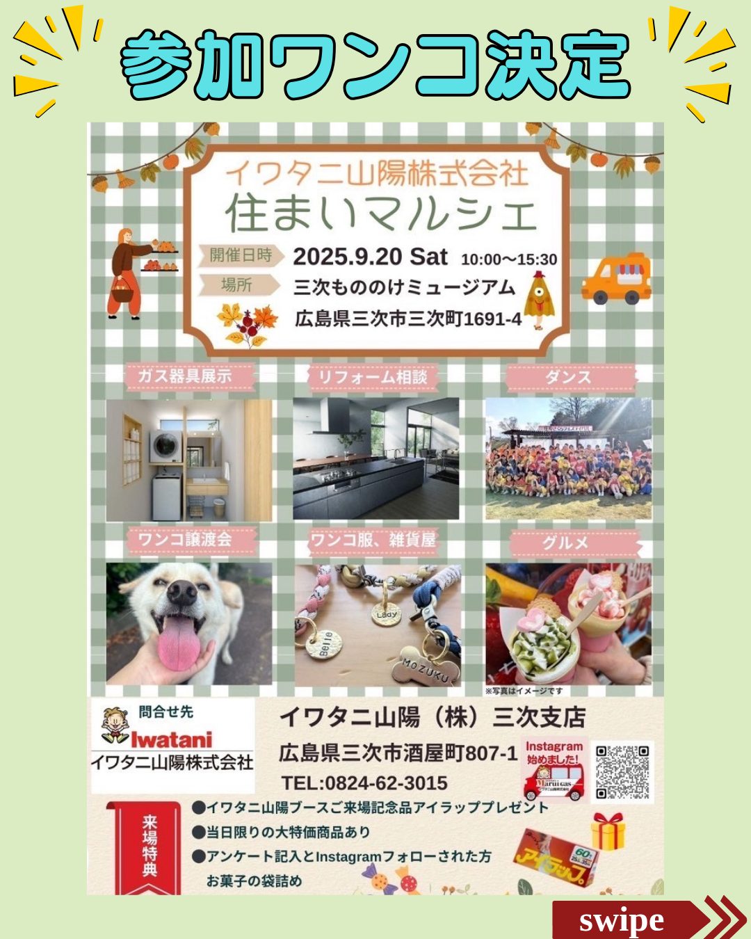 9月20日(土)三次市三次町の「三次もののけミュージアム」で開催されるイベント「イワタニ山陽株式会社 住まいマルシェ」に、譲渡会で参加させていただくことが決定しました!