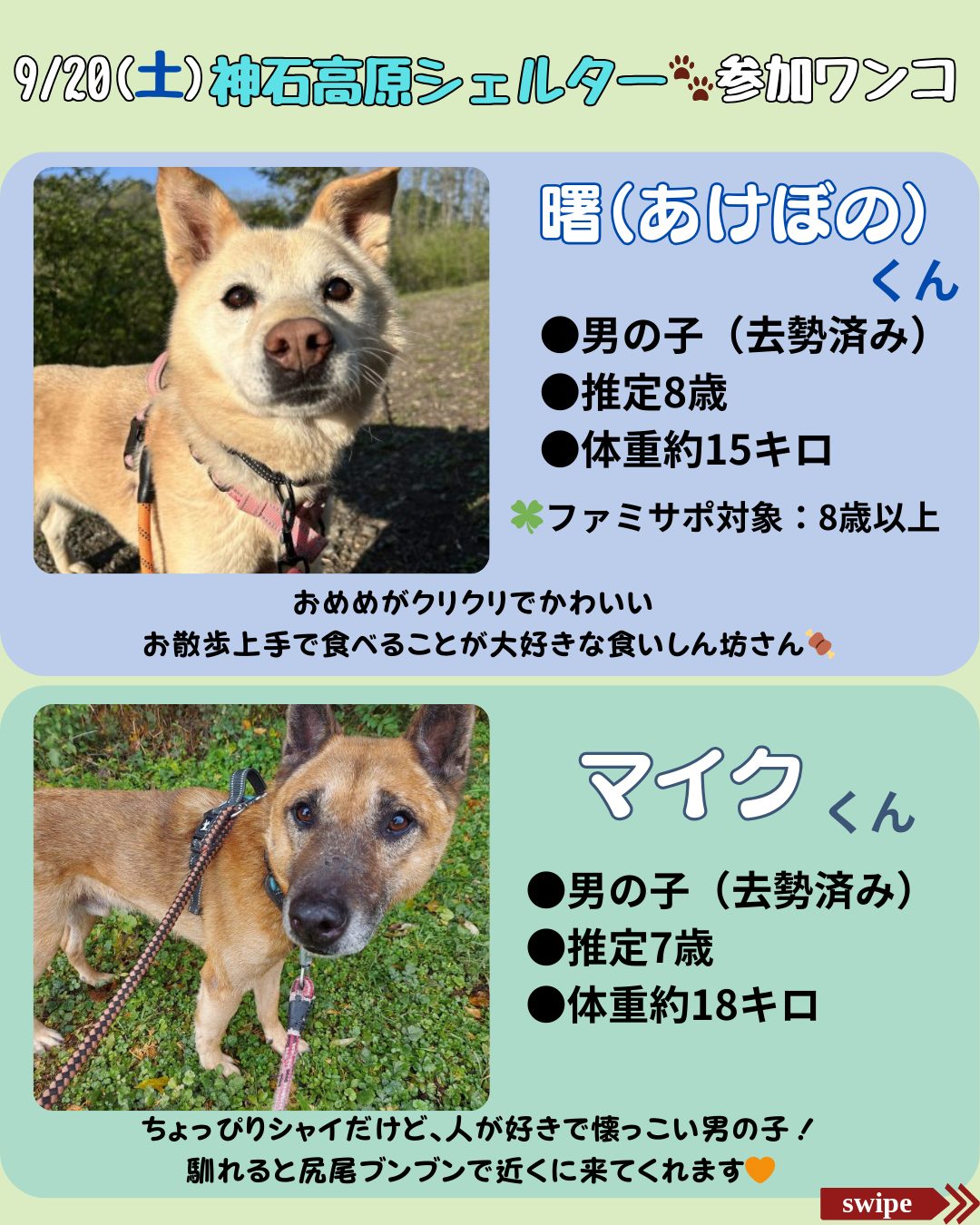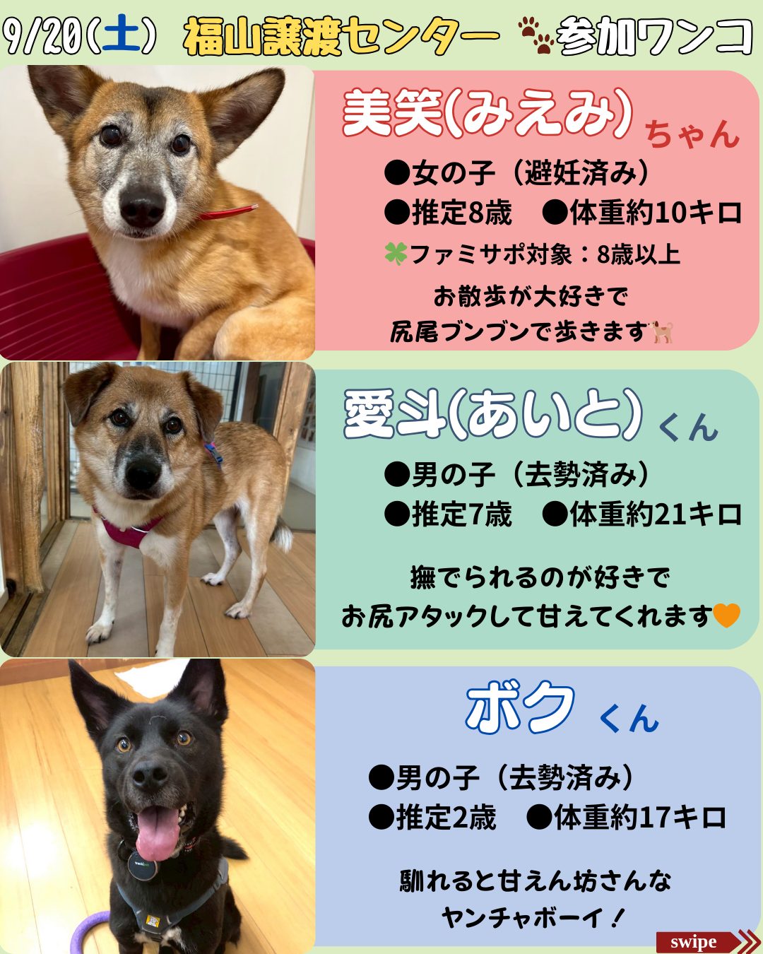 福山譲渡センターと神石高原シェルターから家族募集中のワンコたちが参加するので、是非ワンコ達に会いにお越しください♪