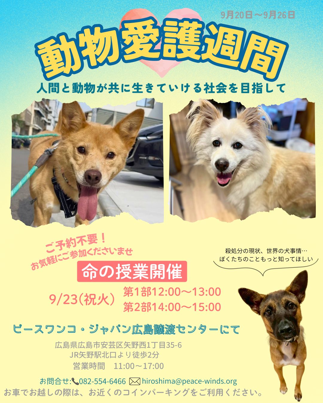 【ピースワンコの譲渡会】9/23(祝火)「動物愛護週間〜人間と動物が共に生きていける社会を目指して〜」開催(広島譲渡センター)