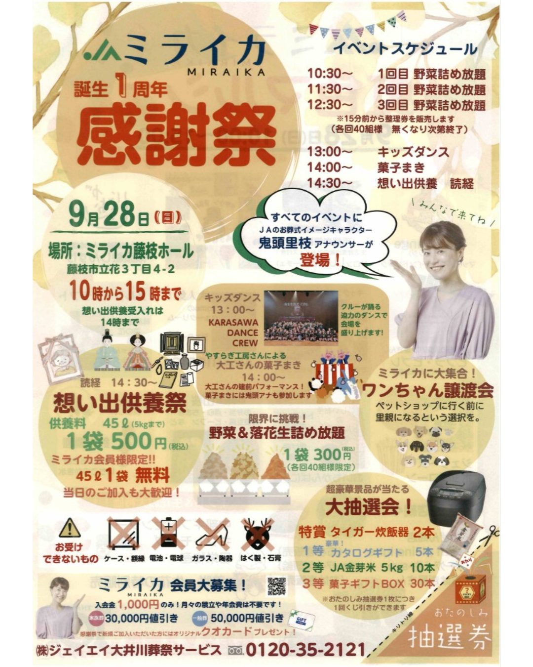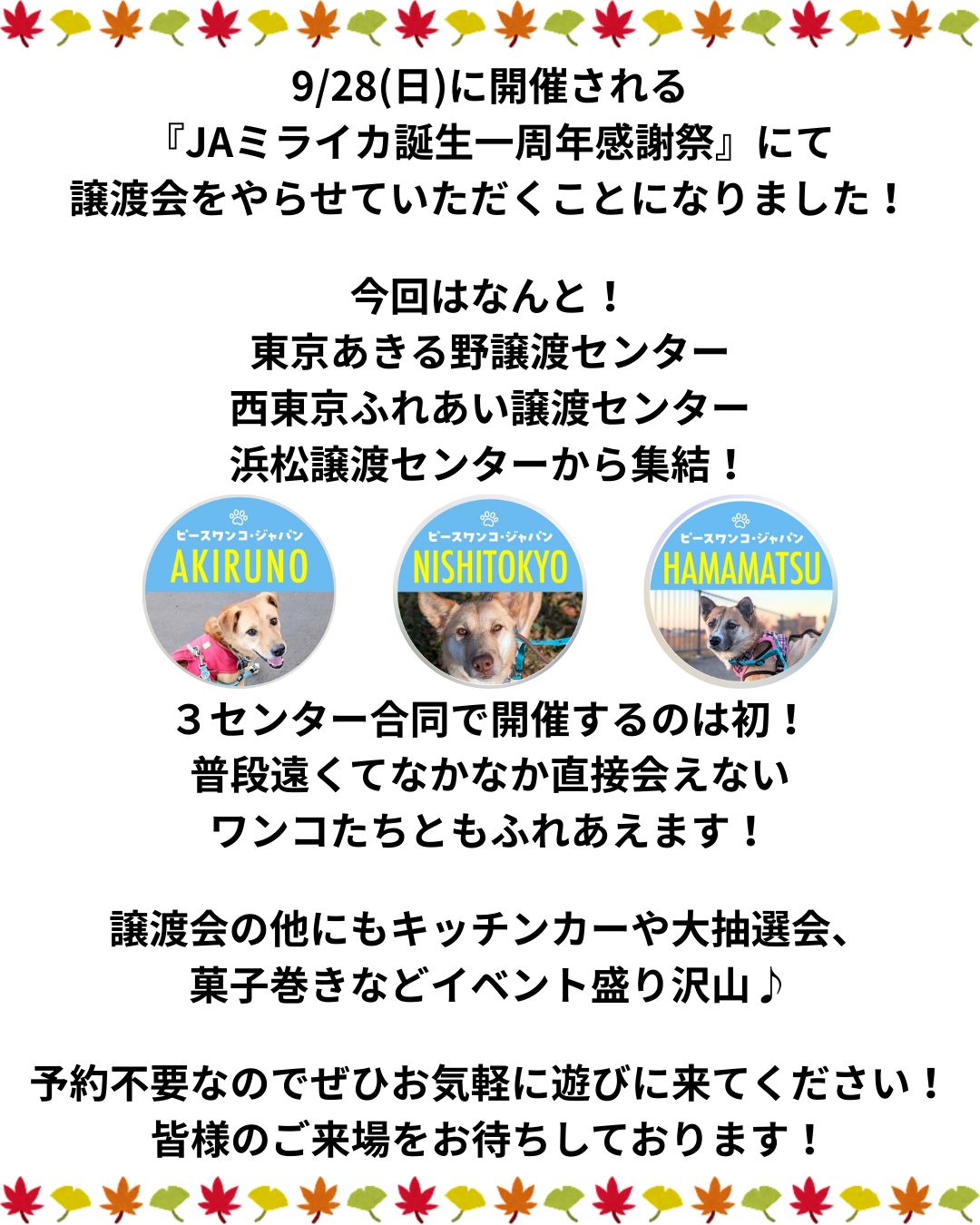 9/28(日)静岡県藤枝市にありますミライカ藤枝ホールで行われる【JAミライカ誕生1周年感謝祭】にて「保護犬譲渡会」を行なわせていただだくこととなりました!時間は10時から15時までです。今回の譲渡会はいつもとは違いなんと…東京あきる野譲渡センター×西東京ふれあい譲渡センター×浜松譲渡センターの3店舗が参加する大賑わいな譲渡会となります‼距離がありなかなか会いに行くのは難しいと感じていたかわいいワンコ達が藤枝に大集合いたします。3店舗合同譲渡会は初めてとなりますので、この機会を逃さず、是非お越しくださいませ。キッチンカーや大抽選会、お菓子まきなど楽しいイベント盛りだくさんです♪