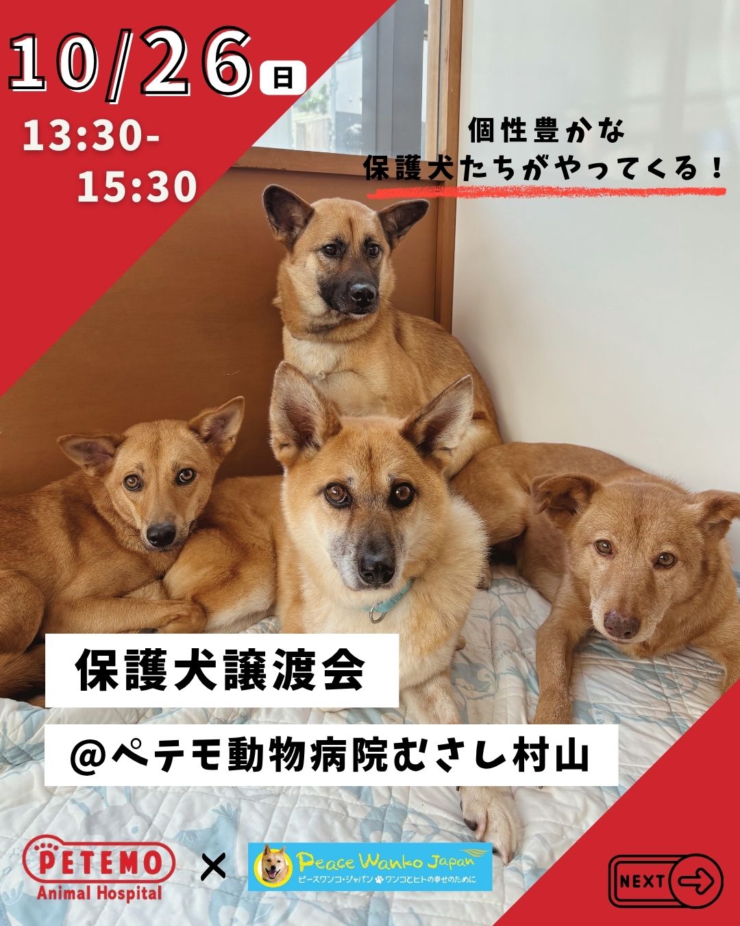 東京都武蔵村山市にございますぺテモ動物病院むさし村山店様のスペースをお借りして譲渡会を開催させていただけることとなりました🐕🍁