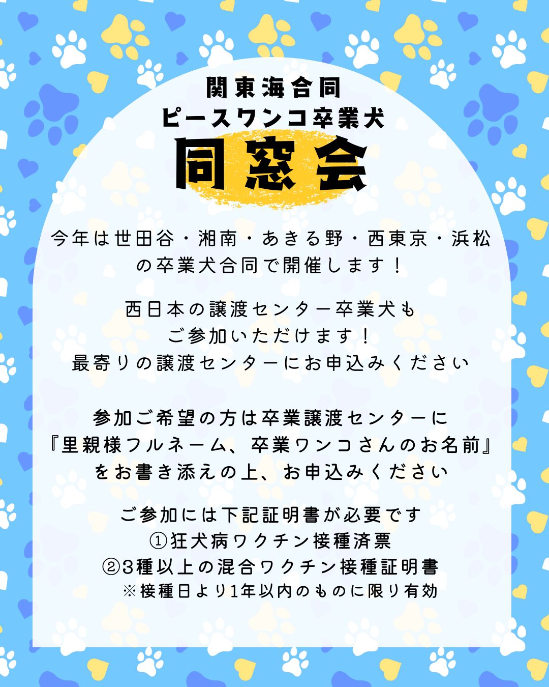 2025年11月8日(日)に、東京都あきる野市にて関東海譲渡センター合同のピースワンコ卒業犬の「里帰り同窓会」イベントを開催します!
