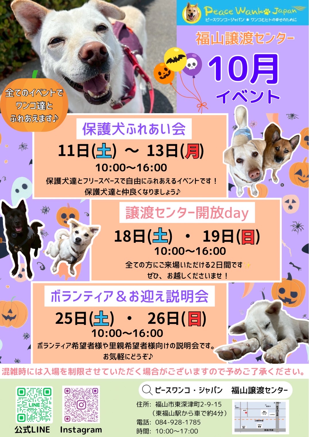 【ピースワンコのイベント】10/25(土)、26(日)ボランティア&お迎え説明会(福山譲渡センター)