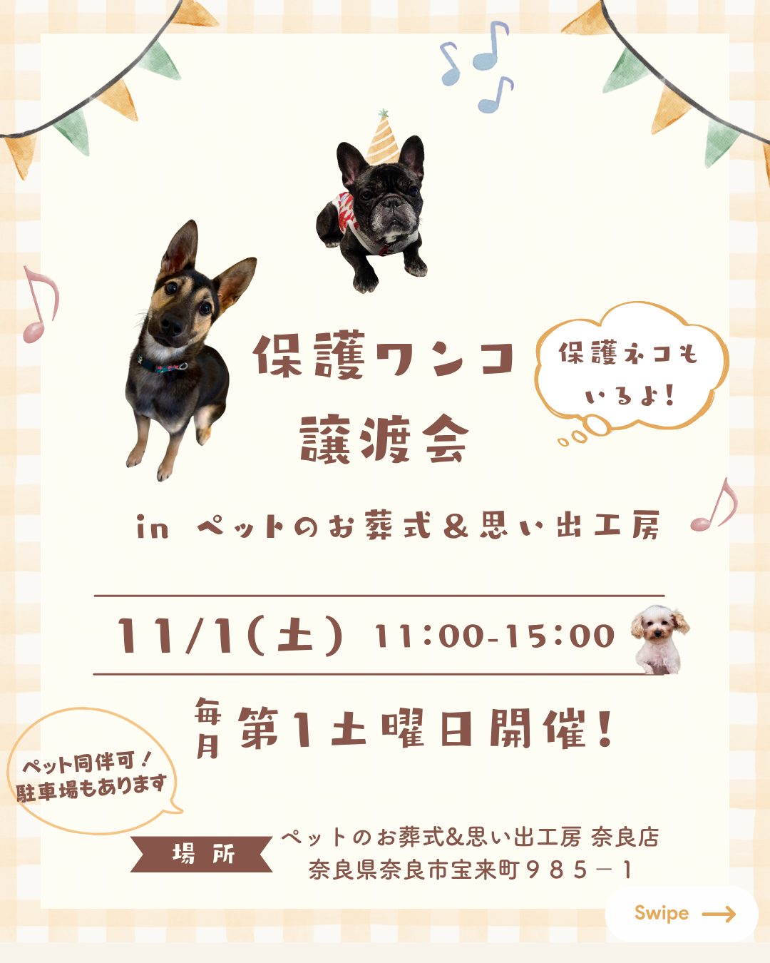 2025年11月1日(土)、ペットのお葬式&思い出工房様にて、室内譲渡会を開催させていただきます。生駒譲渡センターで家族を探しているワンコたちとかわいいワンコやニャンコのご家族を探している団体様が参加します。今回、参加する保護団体は『ねこマンマ』さんです。
