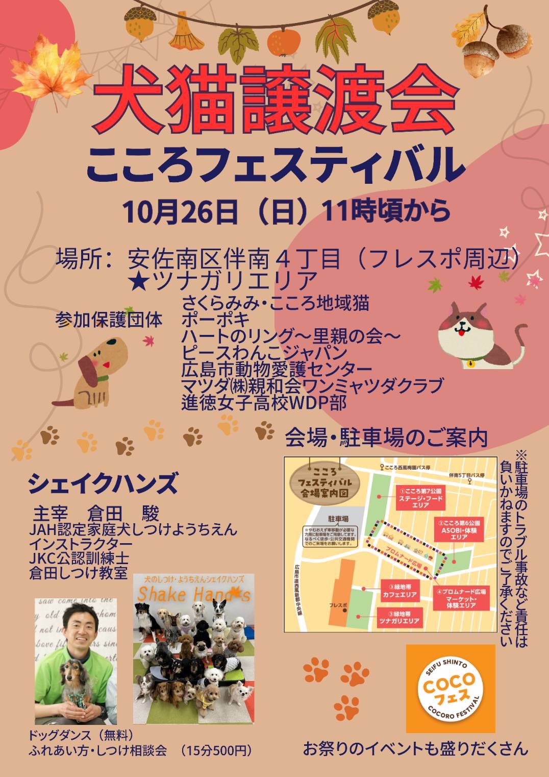 第19回こころフェスティバルの譲渡会にピースワンコも参加させていただきます。