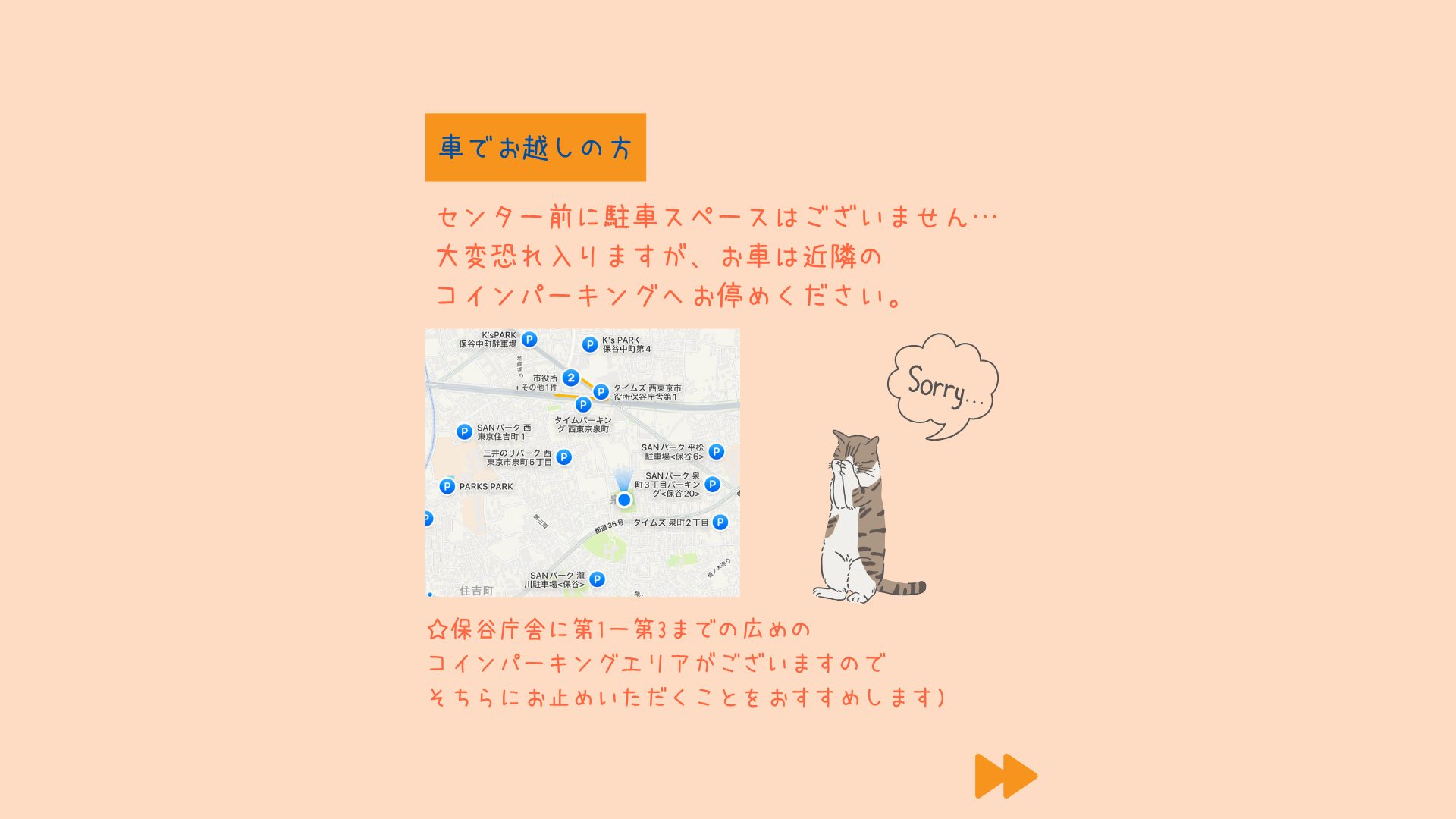*センター前には、駐車場はございません。 お手数おかけしますが、お近くのコインパーキングをご利用くださいませ。 (保谷庁舎に第1ー第3までの広めのコインパーキングエリアがございますのでそちらにお止めいただくことをおすすめいたします)