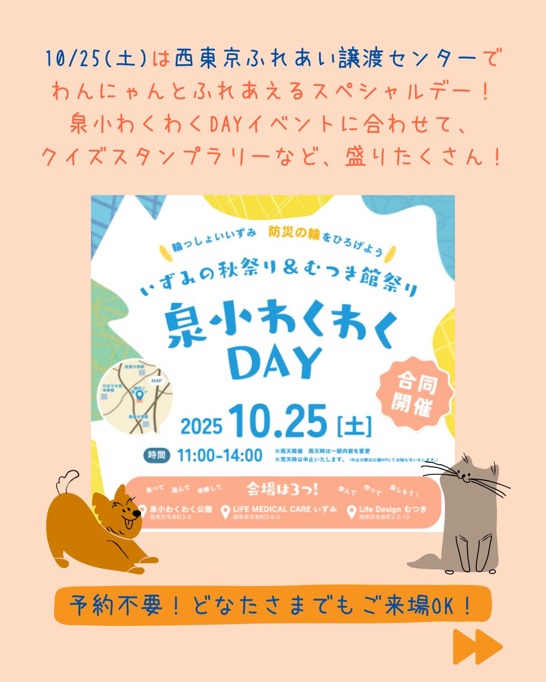 【ピースワンコのイベント】10/25(土)「わんにゃんDAY」を開催(西東京ふれあい譲渡センター)