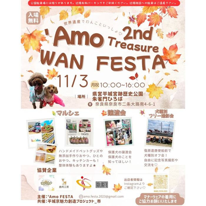 2025年11月3日(月・祝)に開催されるイベント「Amo WAN FESTA Treasure 2nd in奈良県立平城宮跡歴史公園」にて、譲渡会をさせていただきます♪ワンコに関する素敵なお店がたくさん出店されるイベントです!