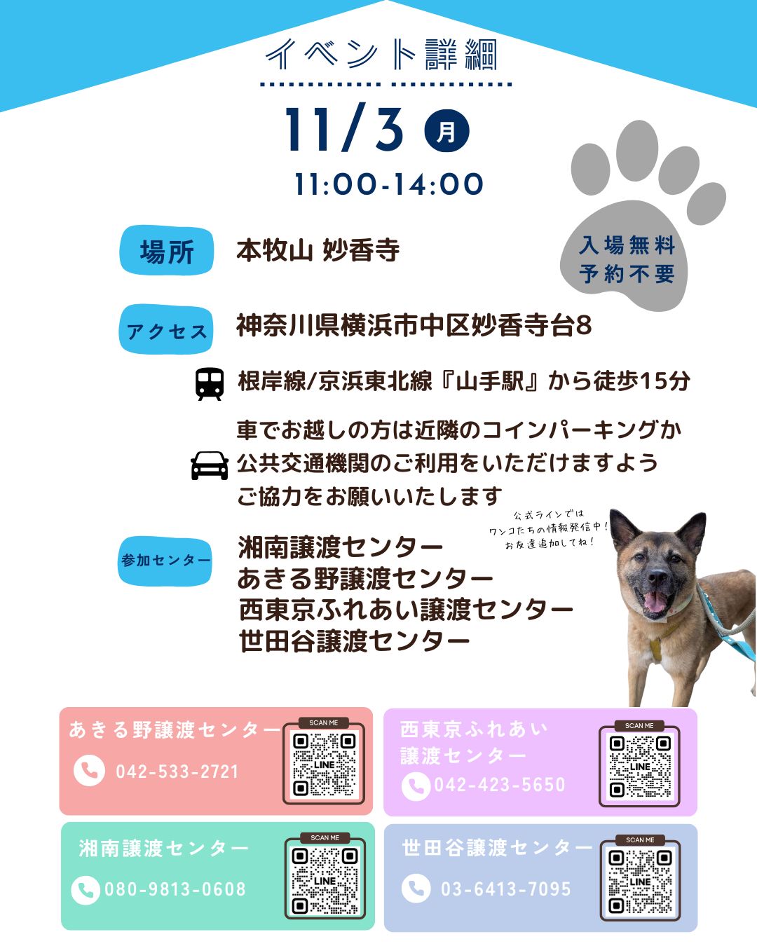 11月3日(月)、横浜市本牧にある妙香寺様の場所をお借りして保護犬譲渡会を開催させていただきます🍁