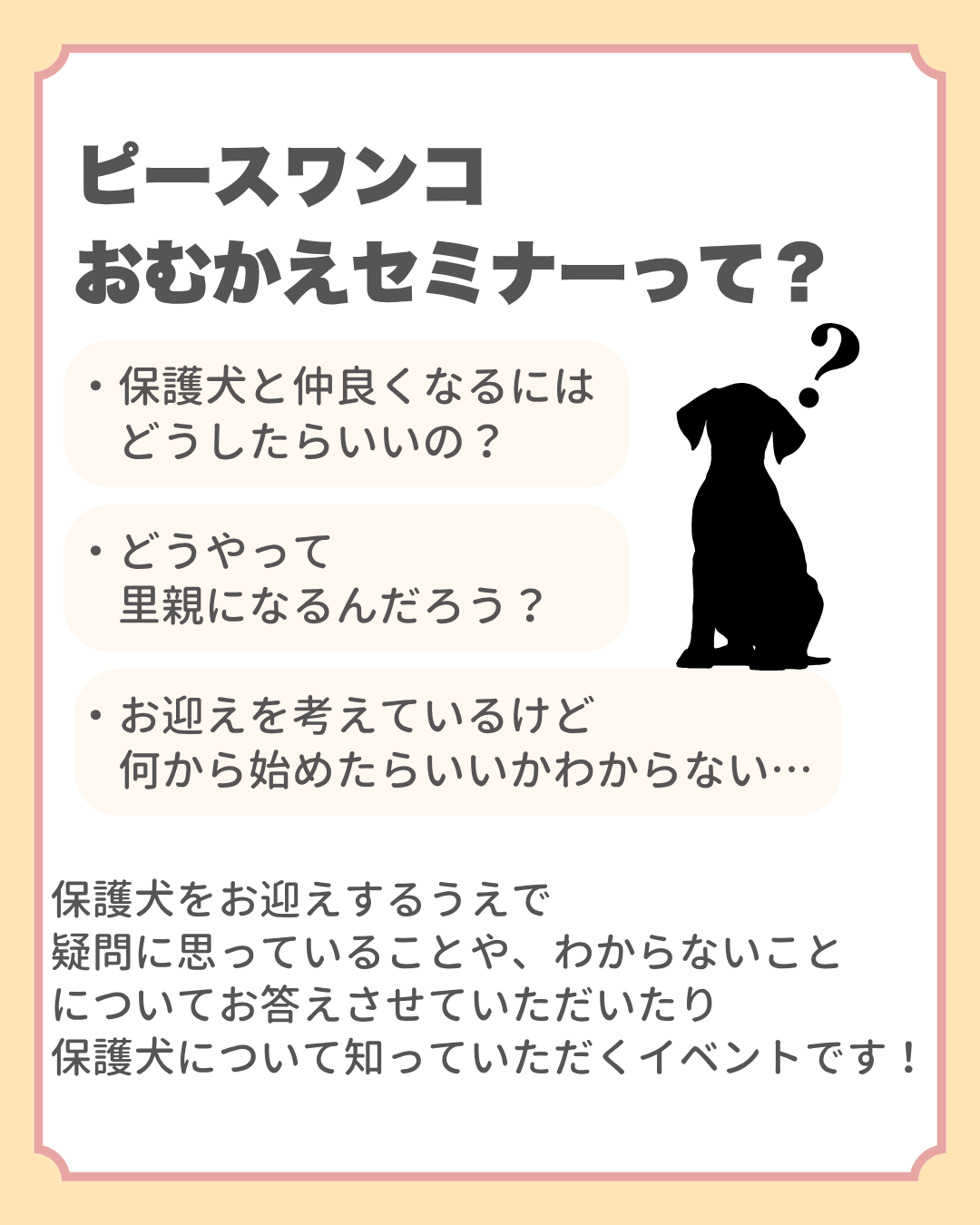 ピースワンコはどんな保護犬なのか、譲渡までの流れや保護犬をお迎えする準備などご説明させていただきます✨