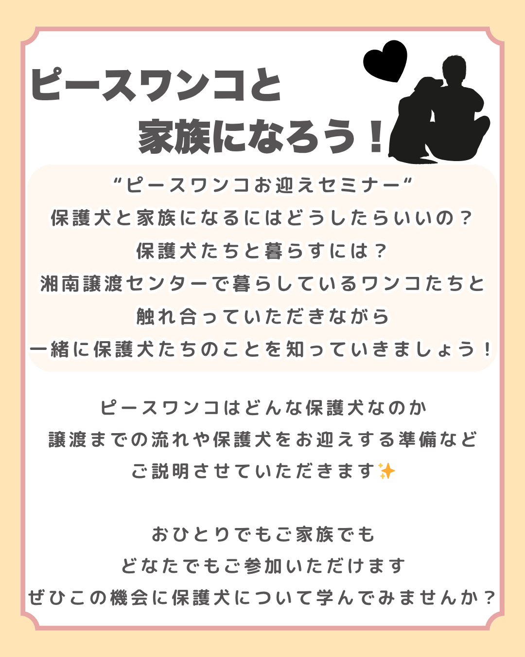 【ピースワンコのイベント】11/24(祝月)ピースワンコおむかえセミナー ※予約制(湘南譲渡センター)