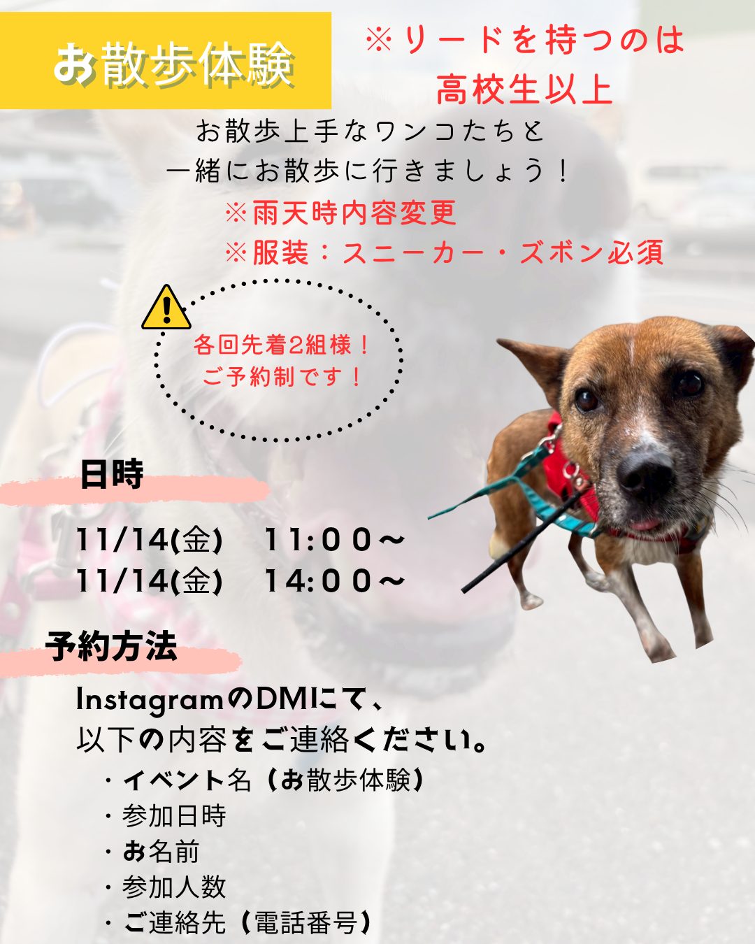 ・11/14(金) お散歩体験 ※リードを持てるのは高校生以上、雨天時内容変更、服装はスニーカーとズボン必須