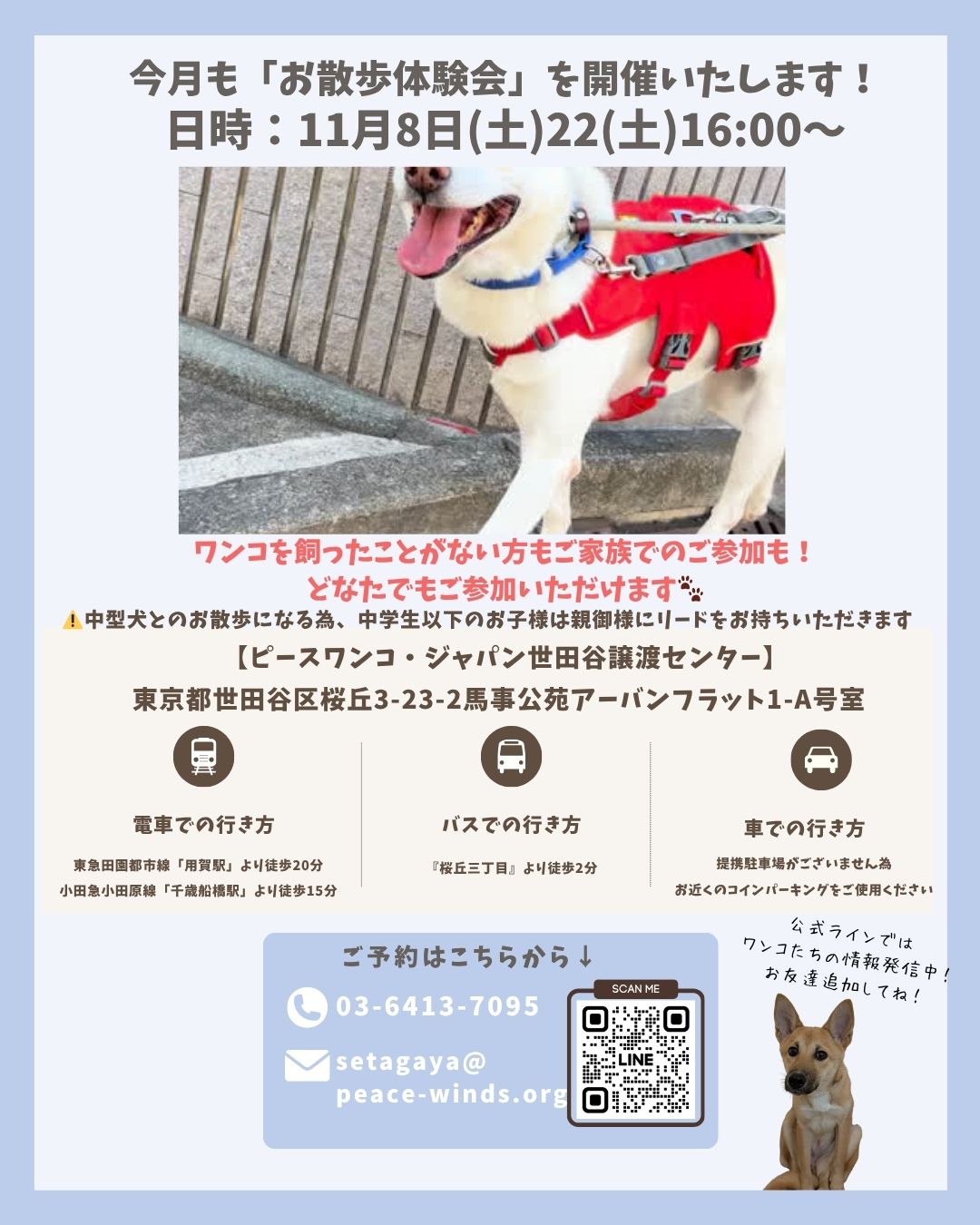 『お散歩体験会に参加したい!』という方は、ぜひ世田谷譲渡センターまでお問い合わせくださいませ!
