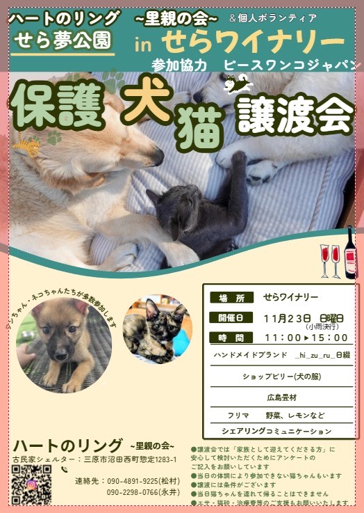 11月23日(日)、広島県世羅郡にある「せらワイナリー」様にて「保護犬猫譲渡会」が開催されます。