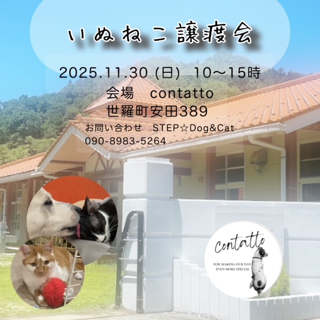 11月30日(日)、広島県世羅郡にあるContatto(コンタット)様にて「いぬねこ譲渡会」が開催されます。