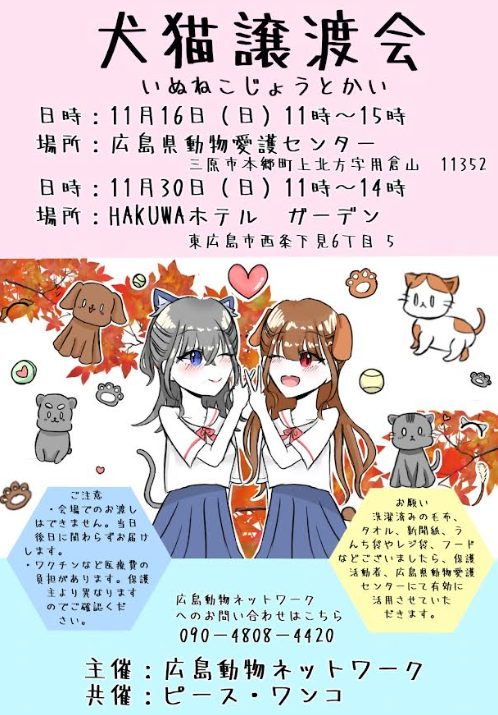 【ピースワンコの譲渡会】11/30(日)「犬猫譲渡会」に参加(広島/東広島市)