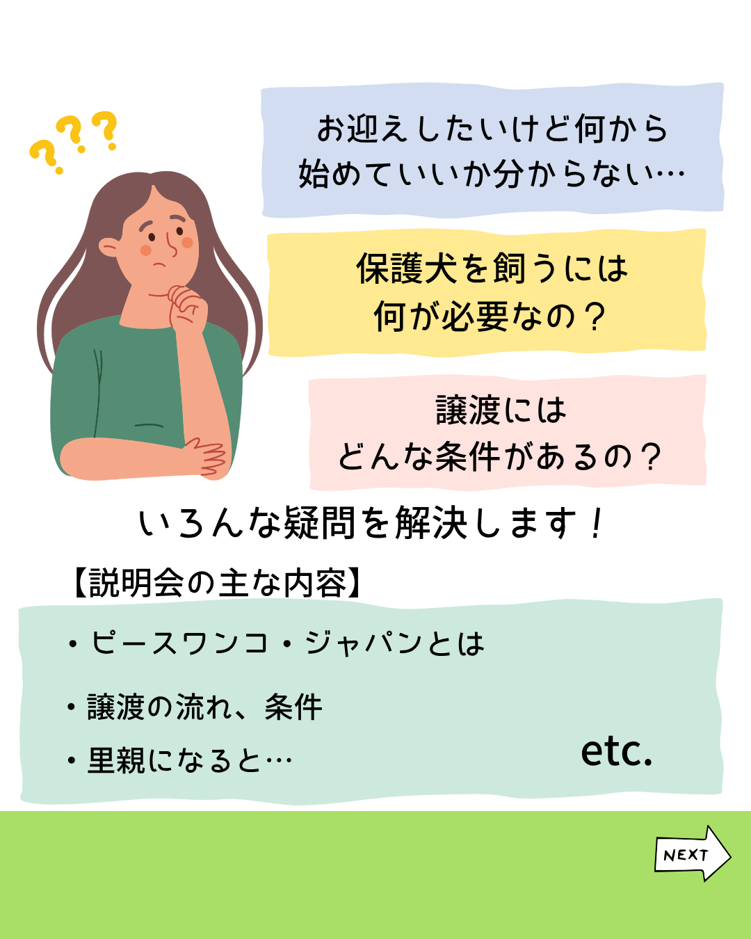 つきましては、下記日程で「保護犬お迎え説明会」を開催いたします。