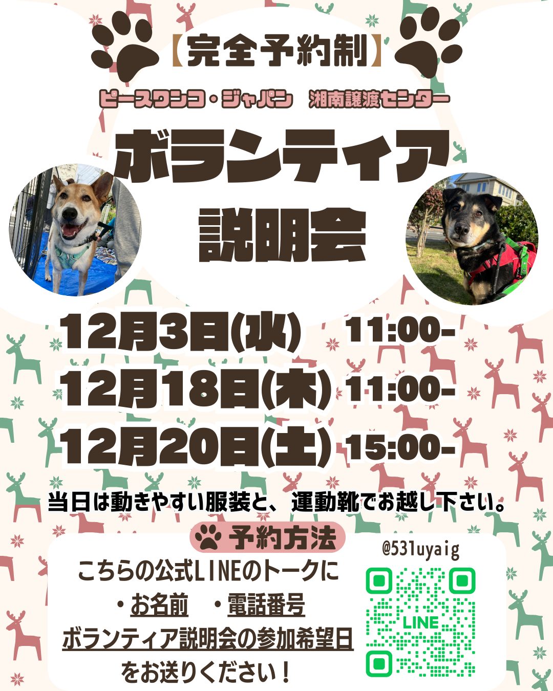 - 画像のQRコードの読み取り。またはIDを検索して、【ピースワンコ・ジャパン 湘南譲渡センター】の公式LINEを追加していただき、メッセージにて・参加希望日程 ・お名前 ・電話番号をお送りください。