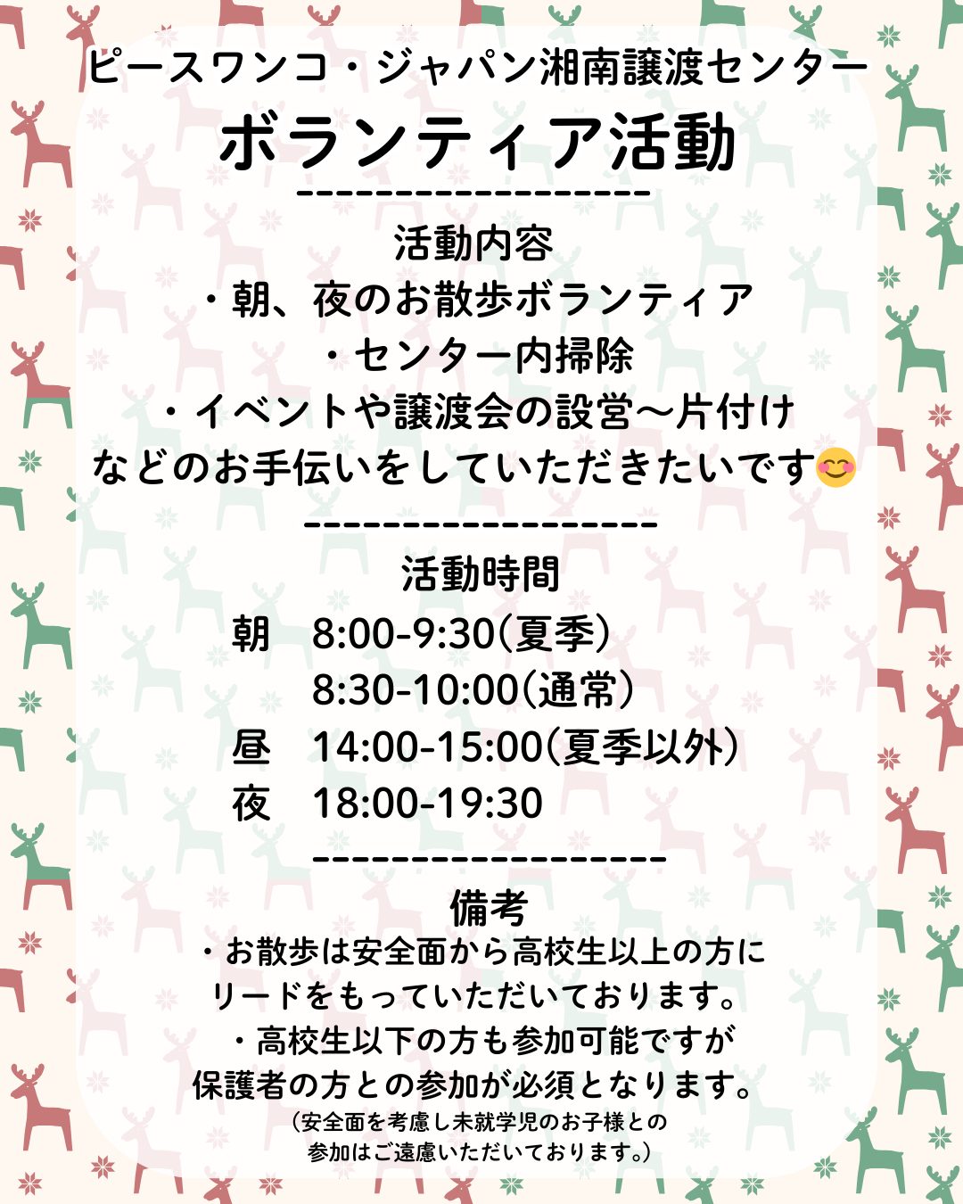 【活動時間】朝:8:30-10:00(夏季は8:00-9:30) 昼:14:00-15:00(夏季以外) 夜:18:00-19:30