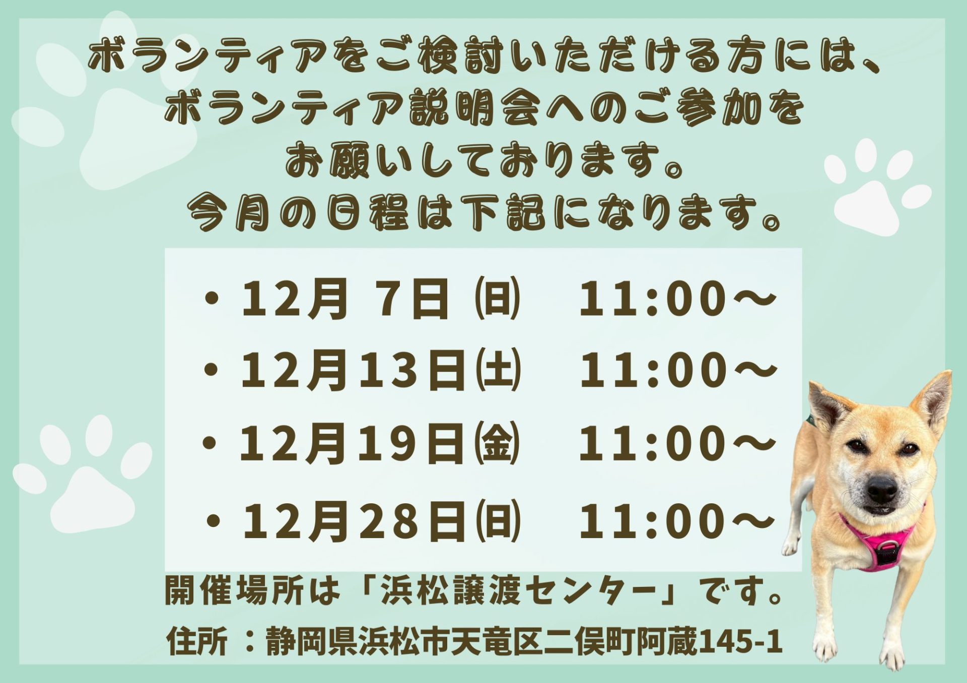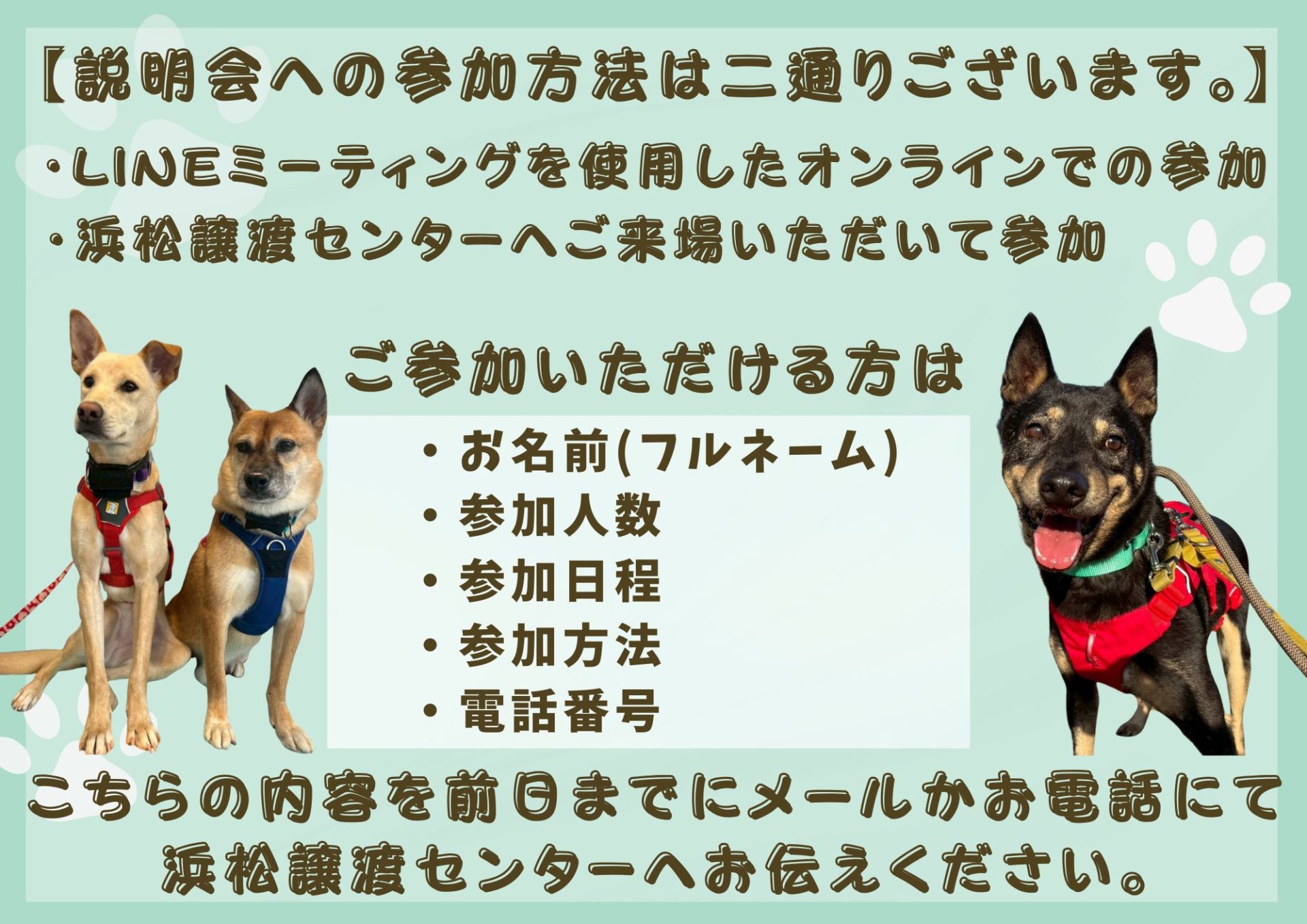 - 予約制での開催です。 【説明会の日時】【お名前】【参加人数】【電話番号】【オンラインor来場どちらかを希望】を添えて、メールまたはお電話にて参加希望日前日までにお申し込みください。 ご不明点等ございましたらお気軽にお問い合わせくださいませ。 ご来場の方は説明会後にワンコ達の説明やふれあい、簡単な施設案内をさせていただきますので動きやすい服装でご来場いただきますようお願いいたします。