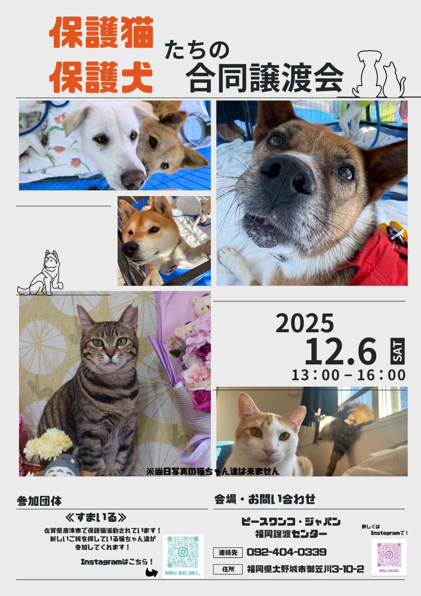 【ピースワンコの譲渡会】12/6(土)「保護犬猫合同譲渡会」を開催(福岡譲渡センター)