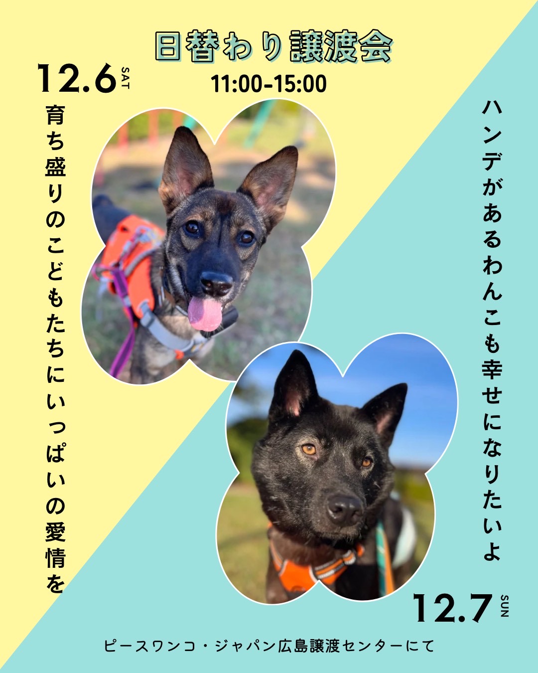 12月6日(土)、7日(日)の2日間、神石高原シェルターと合同で「日替り譲渡会」を開催いたします。