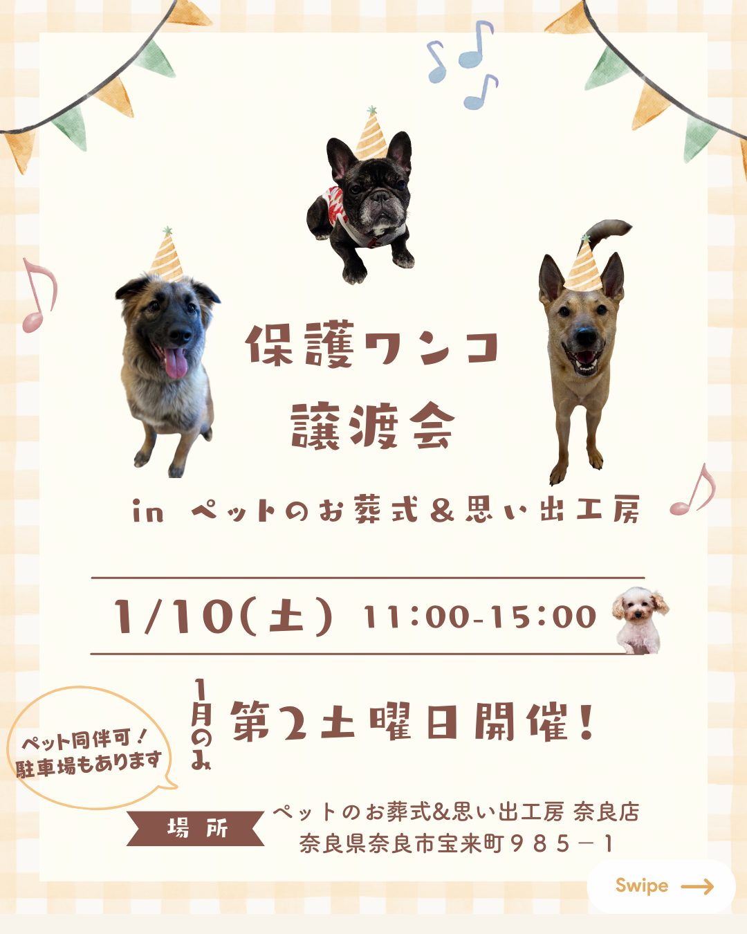 2026年1月10日(土)にペットのお葬式&思い出工房様にて、室内譲渡会を開催させていただきます。生駒譲渡センターで家族を探しているワンコたちとかわいいワンコのご家族を探している団体様が参加します。今回、参加する保護団体は『つむぐ奈良』さん、『ねこマンマ』さん、『Enn』さん、『にゃらとも』さんです。