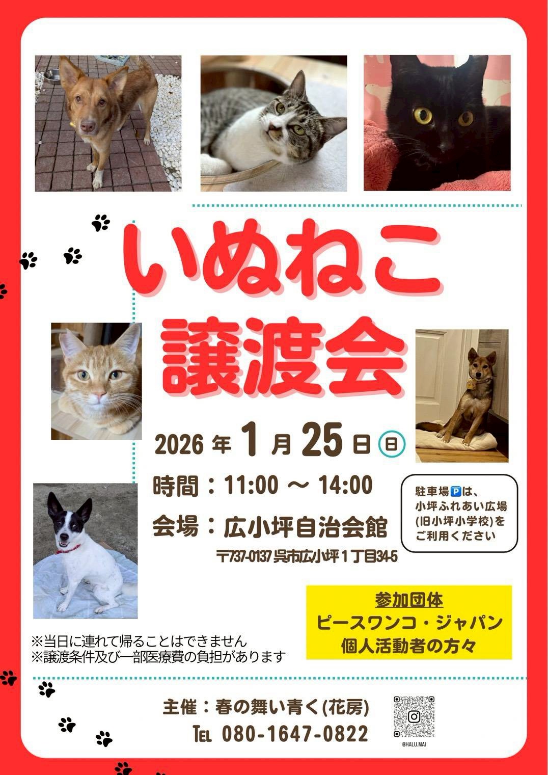 【ピースワンコの譲渡会】1/25(日)「いぬねこ譲渡会」に参加(広島/呉市)
