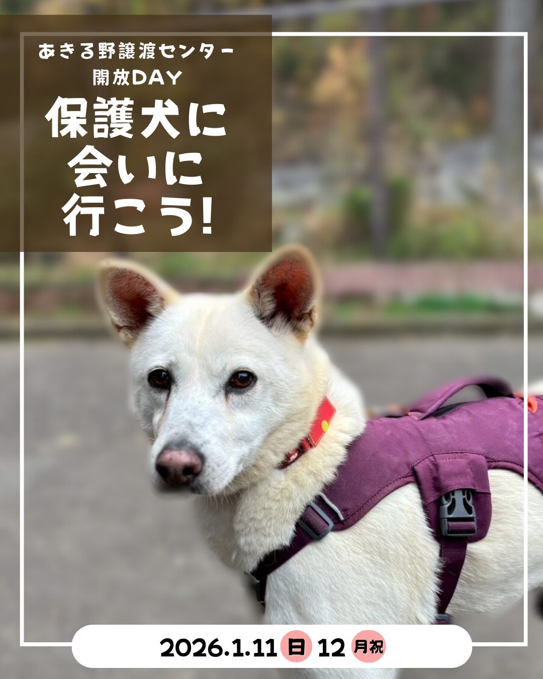 1/11(日)、12(月祝)に、センター開放DAY「保護犬に会いに行こう!」を開催します。