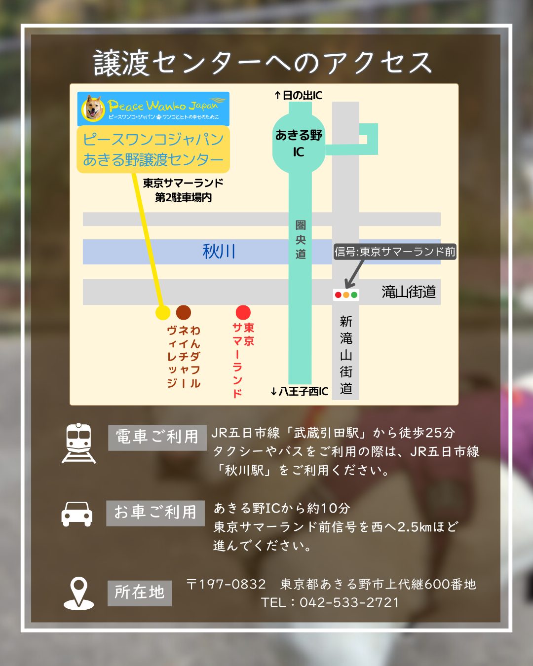 ※東京サマーランドより1kmほど川沿いの道を進み、「わんダフルネイチャーヴィレッジ」駐車場内となります