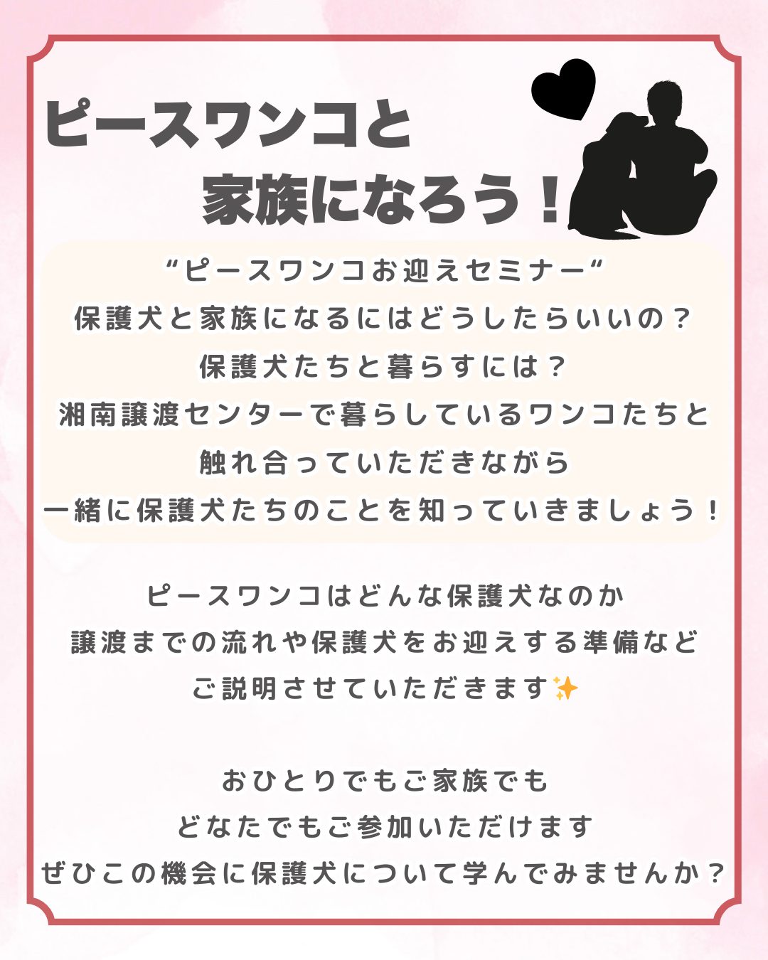 ピースワンコはどんな保護犬なのか、譲渡までの流れや保護犬をお迎えする準備などご説明させていただきます✨