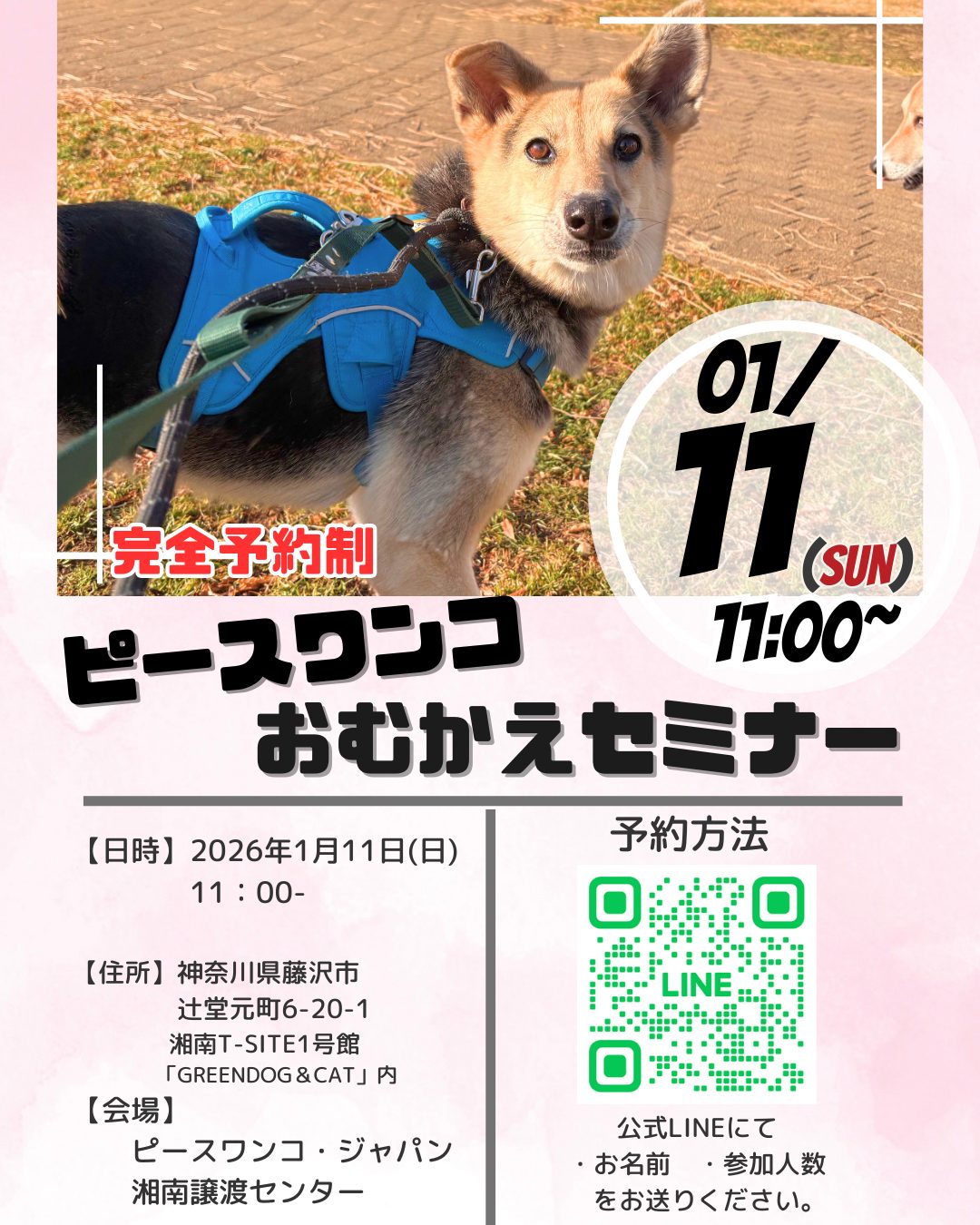 湘南譲渡センターの公式LINEアカウントを追加していただき、・お名前 ・参加人数をお送りください。