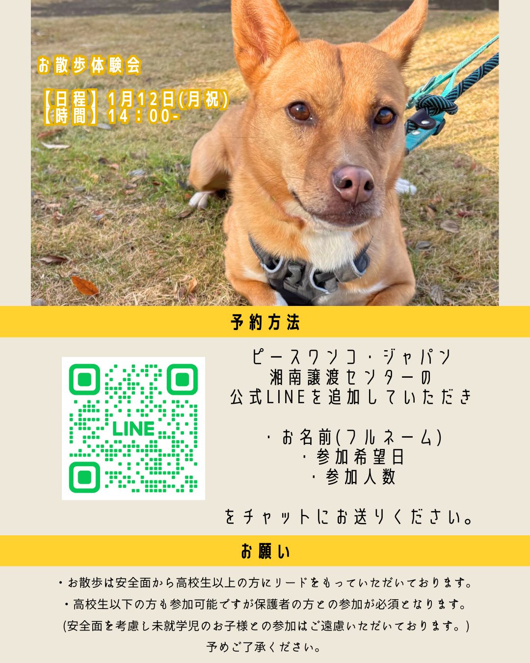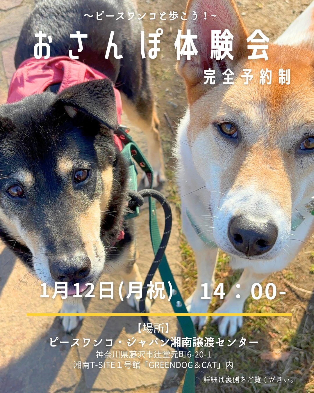 【ピースワンコのイベント】1/12(祝月)ピースワンコと歩こう!お散歩体験会【予約制】(湘南譲渡センター)