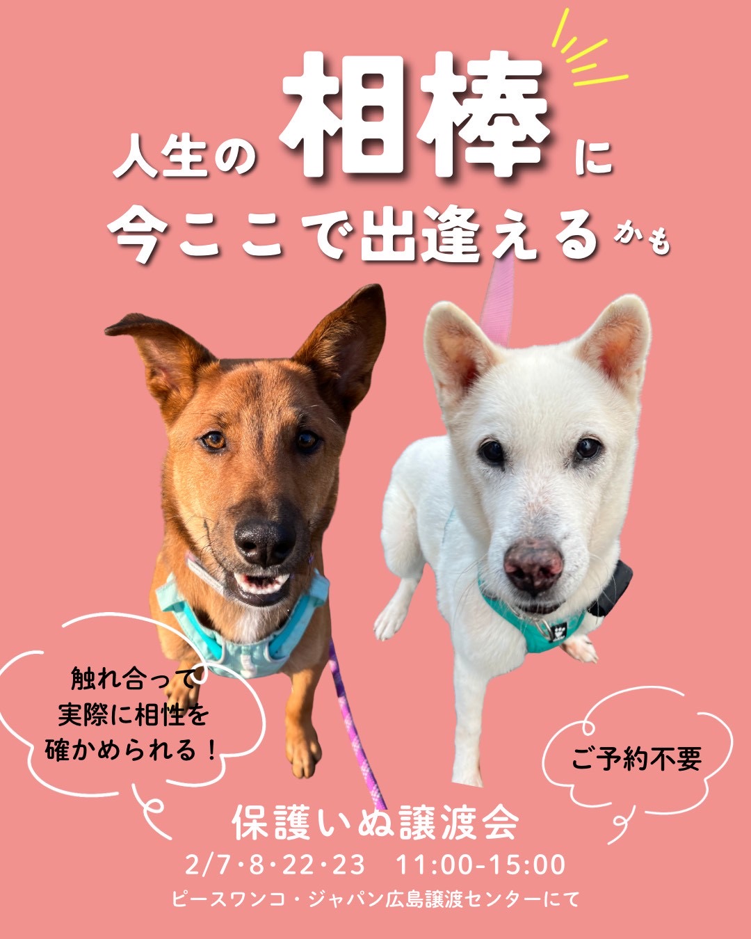 【ピースワンコの譲渡会】2/7(土)、8(日)「保護いぬねこ譲渡会」開催(広島譲渡センター)