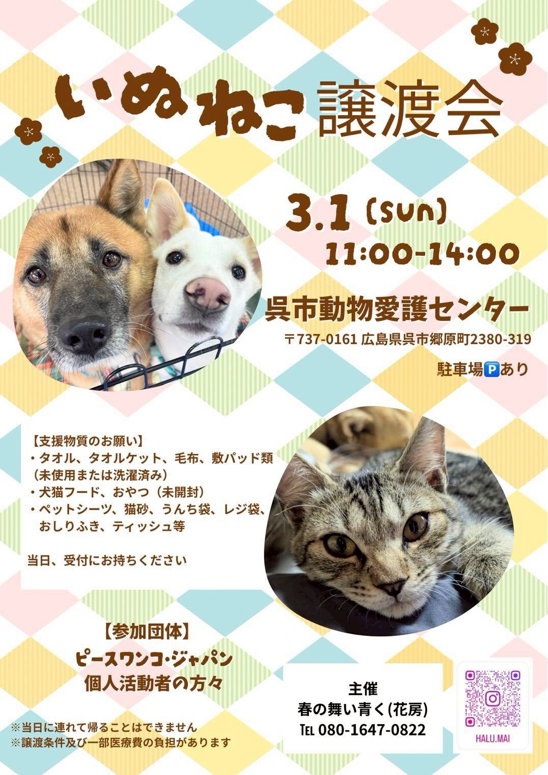 呉市動物愛護センターにて開催される春の舞い青く様主催の「いぬねこ譲渡会」に、