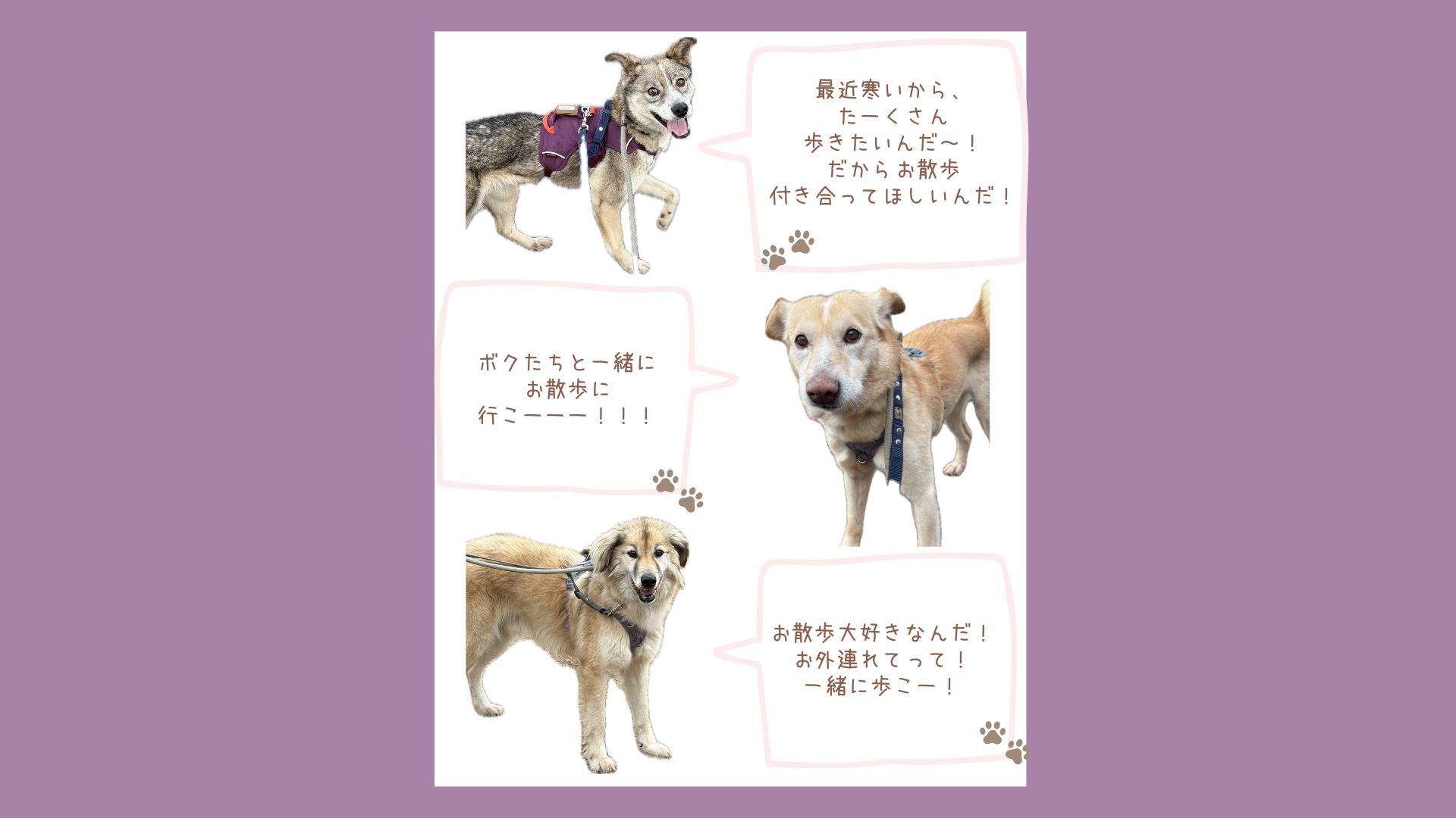 ※中型犬のワンコたちとのお散歩となるため、リードは高校生以上の方からお持ちいただけます。