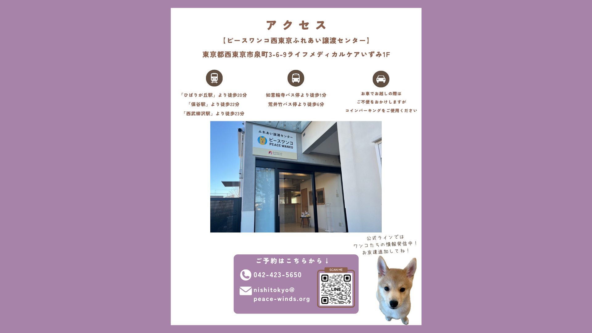 電話番号: 042-423-5650(ピースワンコ西東京ふれあい譲渡センター)