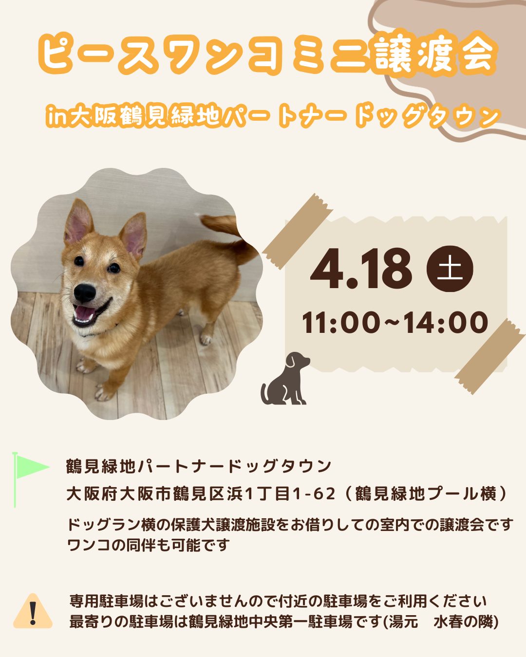 【ピースワンコの譲渡会】4/18(土)「ミニ譲渡会in大阪鶴見緑地パートナードッグタウン」開催(大阪/大阪市)