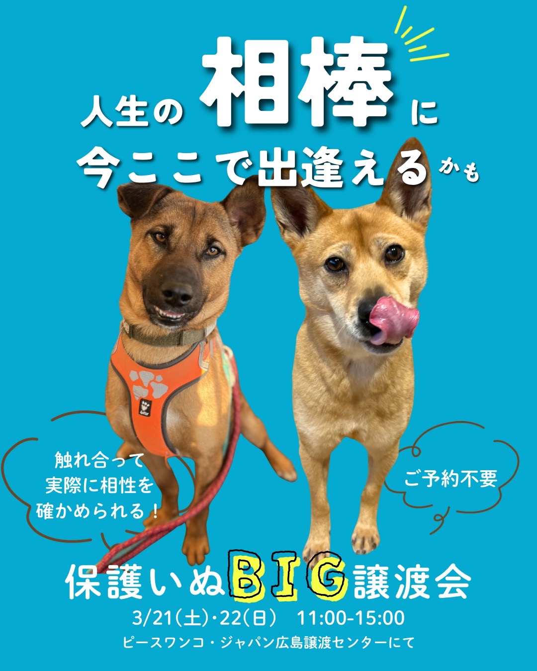 3月21日(土)22日(日)の二日間、広島譲渡センターにて「保護いぬBIG譲渡会」を開催いたします。