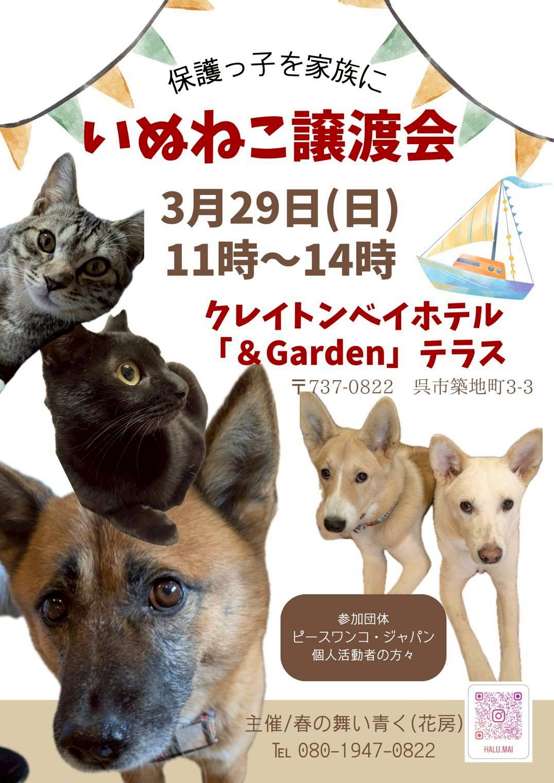 クレイトンベイホテルのテラスで開催される 春の舞い青く様 主催の「いぬねこ譲渡会」に、