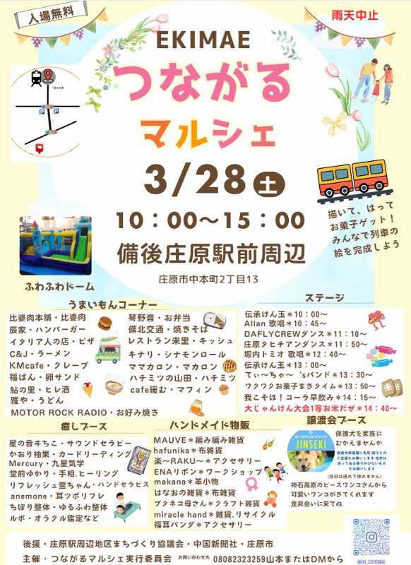 3月28日(土)、広島県庄原市の備後庄原駅前周辺にて「EKIMAEつながるマルシェ」が開催されます。