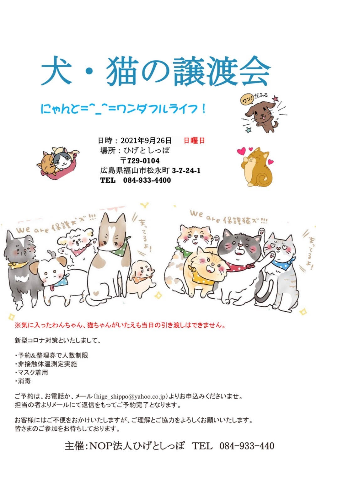 【ピースワンコの譲渡会】9/26(日)「ひげとしっぽ犬・猫の譲渡会」に参加(福山)