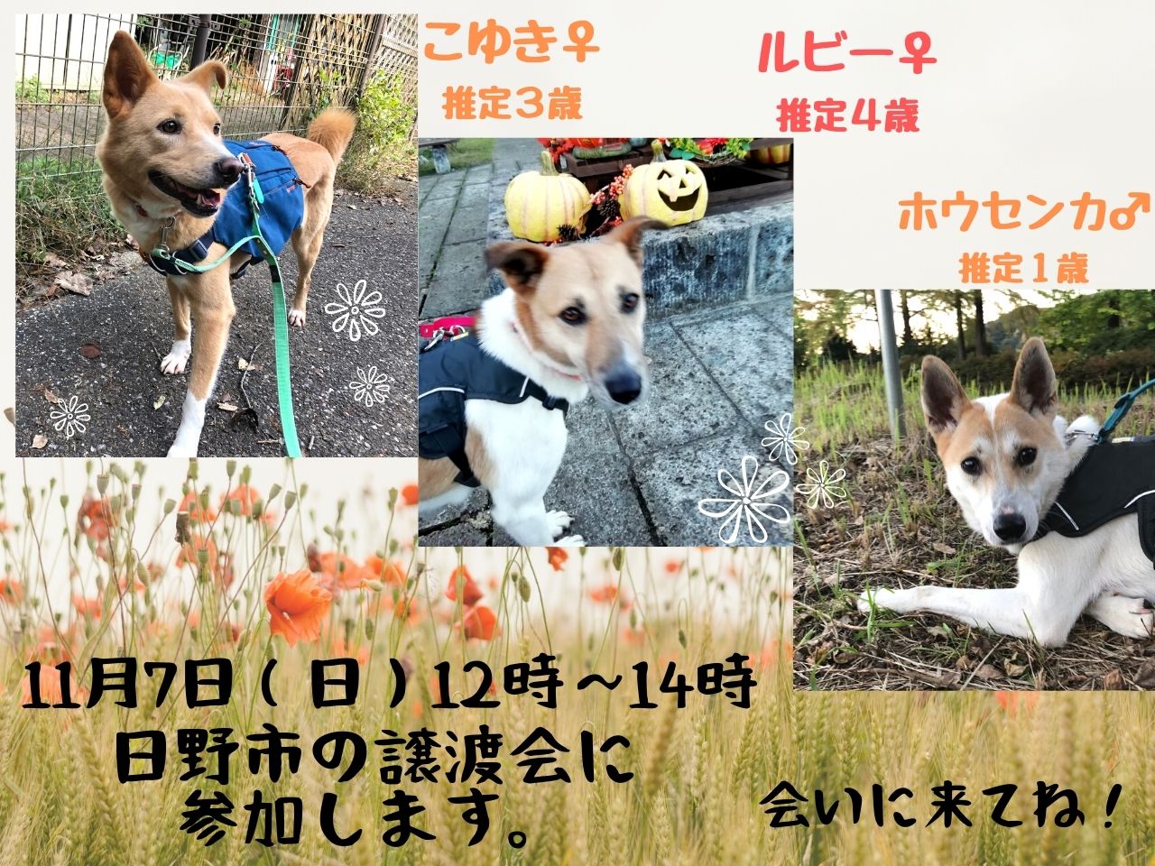 11月7日(日)、東京都日野市で開催される「保護犬・保護猫の譲渡会」に、ピースワンコ・ジャパンあきる野譲渡センターで家族を募集しているワンコが参加します。屋外を会場に、新型コロナウイルス感染防止対策を徹底し、皆様のご来場をお待ちしています。