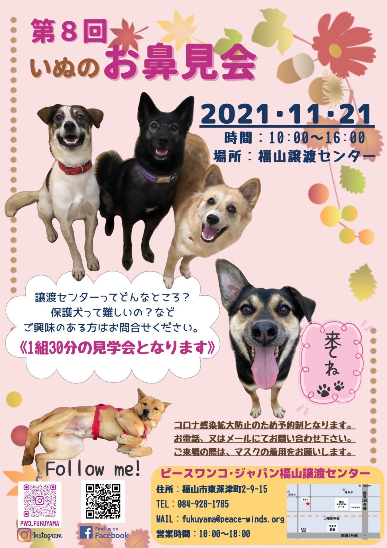 11月21日(日)、ピースワンコ・ジャパン福山譲渡センターで「お鼻見会」を開催します。センターに在籍しているワンコ達を見学して頂き、保護犬を知っていただく機会にしていただきたいと思います。コロナウイルス感染拡大防止のため、1組30分の予約制となります。保護犬に関心がある方や里親になることを検討している方は、お電話、又はメールにてご予約下さい。皆様のご参加をお待ちしております。